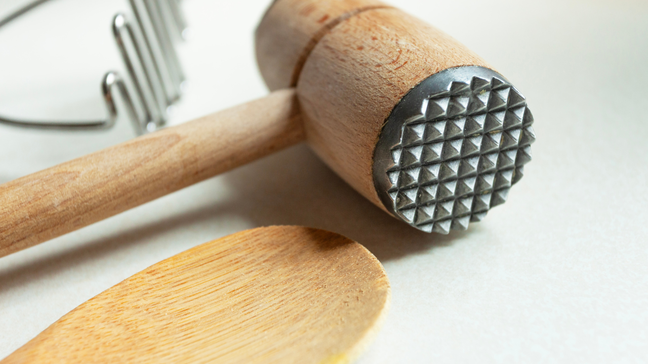 麺棒は叩いて食材を割ったり、肉をやわらかくしたりもします。この用途では、転がせるかよりも硬さと持ちやすさが大事です。ケガや破損が起きやすい場面でもあるので、ここでは安全に代用するコツをセットで紹介します。